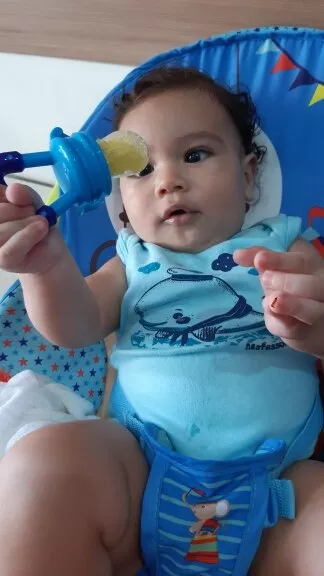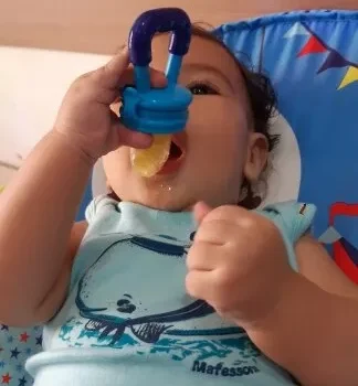 Our 8 month old son is teething really badly (all 4 front teeth at once) and wont eat anything. That all changed when we introduced this teether. We have given him cold oranges, peaches, blueberries, and strawberries much to his liking. At first he would only chew on it when we held the teether for him, but now (1 week later) he is able to hold it himself to adjust the position to his liking. Love that it comes with several inserts as it allows us to change up the fruits during each feeding without stopping to clean. Only complain is one of the teether inserts has turned yellow/orange after the very first use.