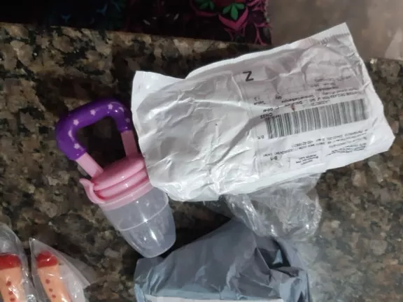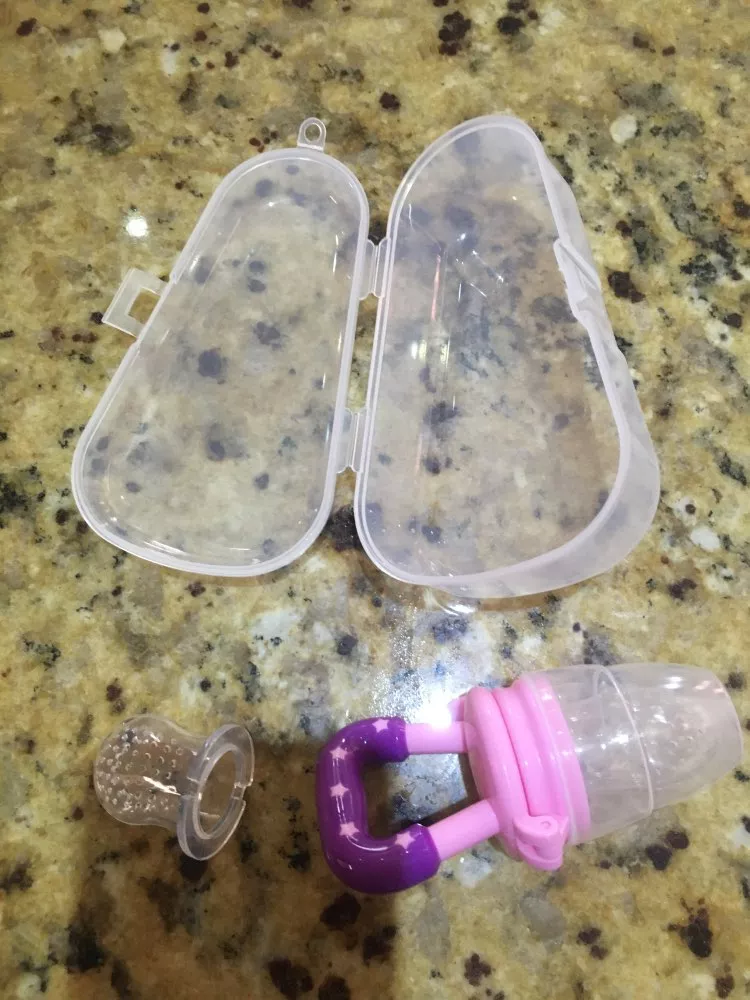 These items are exactly as pictured. Based on some of the previous comments I was a bit concerned about how much food you could fit into the pacifier and if it would be enough, but the juices squeezed through the perfect amount for my five month old and I was able to fit more frozen fruit into the container than I anticipated. The first food that I tried was frozen cranberries. The pacifier piece is a bit large for my baby to suck on. I noticed some competitors offer pacifiers in three different sizes based on your baby's age, but I decided to go with this item because of the reviews and recommendations. Overall it is a great option for allowing your baby to try new foods and not having to be worried about chocking and for babies who are teething.