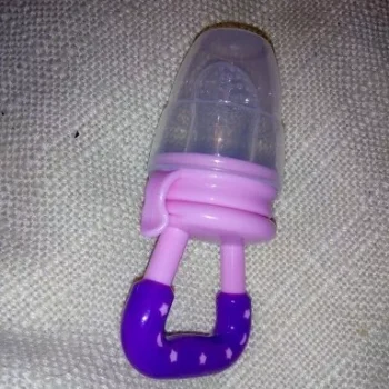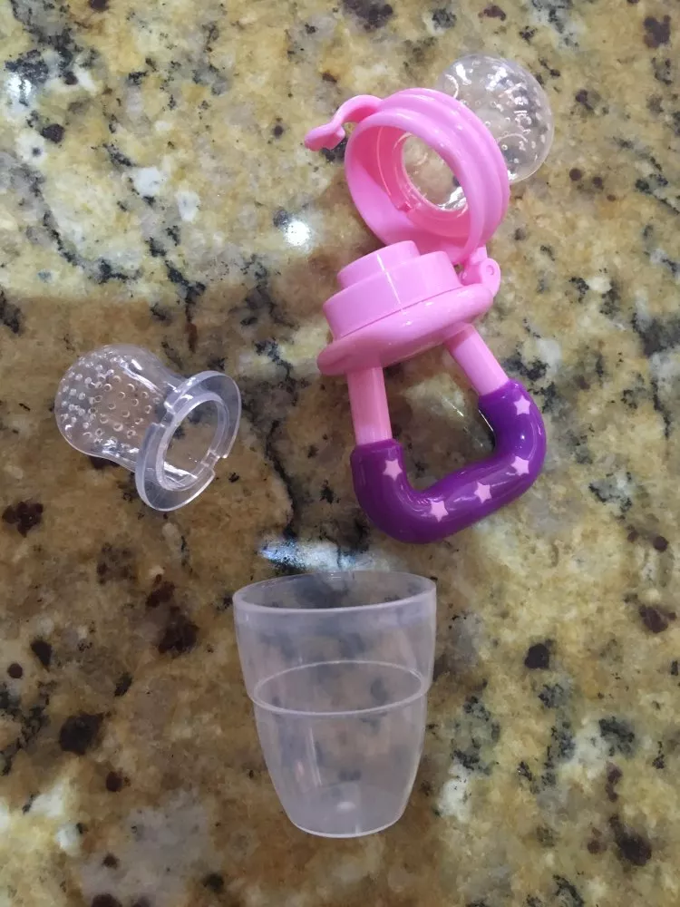 Got this for my 5 month old who just started trying food and has been teething since 3 months with no progress. I used the smallest one with frozen blueberries and she loved it. She can hold it herself with little help and I love that it can be cleaned very easily. We had a mesh feeder and tossed it because it is so hard to clean really well and just gets floppy and gross when the food thaws. This is a much better alternative and great price. My only concern is that the nipple piece can be removed too easily but hasn’t caused any issues yet.